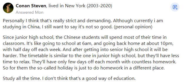 lived in New York (2003-2020)我个人认为中国的教育是非常严格和苛刻的。虽然我现在在中国学习,但我还是想说中国的教育方式不太好(个人意见)。