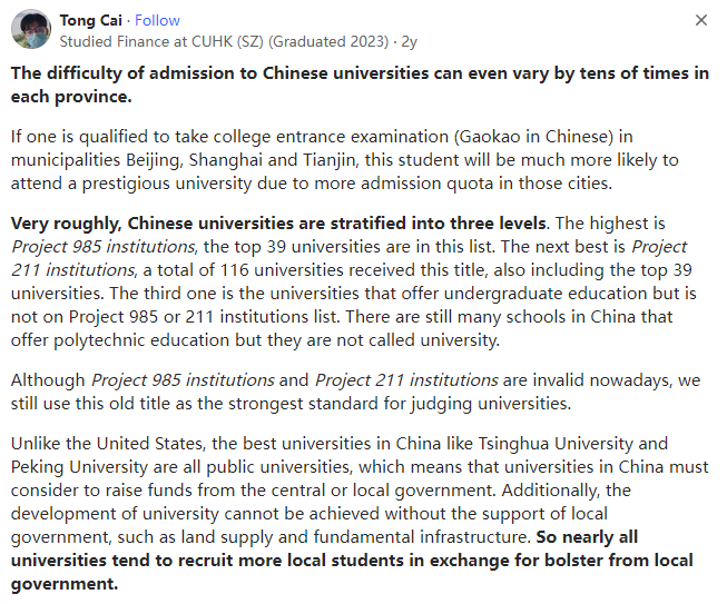如果一个人有资格参加北京、上海和天津等城市的高考,由于这些城市的招生配额更多,这个学生将更有可能进入一所名牌大学。中国的大学大致分为三个层次。排名最高的是985工程院校,排名前39的大学位于这个名单中。其次是211工程院校,共有116所大学获得了这一称号,这也包括了排名前39的大学。第三类是提供本科教育但不在985或211工程名单上的大学。在中国,仍然有许多学校提供理工科教育,但它们不被称为大学。虽然985工程院校和211工程院校的评价体系如今已然失效,但我们仍然将这一旧体系作为评判大学的最有力的标准。与美国不同的是中国最好的大学(如清华大学和北京大学)都是公立大学,这意味着中国的大学必须考虑从中央或地方政府那里筹集资金。此外,大学的发展离不开地方政府的支持,如土地供应和基础设施建设等。因此,几乎所有的大学都倾向于招收更多的本地学生以换取地方政府的支持。然而,中国各省的教育资源非常不平衡。北京是中国的首都,共有八所985大学,包括清华大学和北京大学,而我生活的广东省只有两所985大学。在北京,985大学的入学比例约为4.49%,而在广东,这一比例约为1.41%。北京每年约有6万名学生参加高考,清华大学和北京大学的招生名额都在600人左右,升学率约为1%。而广东省每年约有70万名学生参加高考,两所大学的招生名额都在300人左右,升学率约为0.042%。如果一个来自广东的学生梦想进入中国的顶尖大学,竞争将异常残酷,但在北京,这要容易得多。但广东学生还不是最悲惨的,因为他们还有中山大学和华南理工大学这两所985所大学以及暨南大学和华南师范大学等211所大学可以选择。最悲惨的学生可能是河南省的学生,因为河南省没有985大学。更糟的是什么?河南省每年有100多万学生参加高考!985大学的入学比例约为0.98%。https://en.wikipedia.org/wiki/List_of_universities_in_China#Project_985_institutions