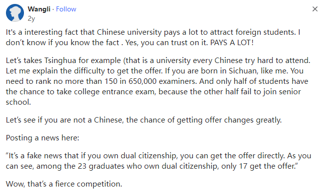 让我们以清华为例(这是一所每个中国人都想努力考进的大学,让我解释一下获得录取的难度。如果你和我一样出生在四川,你需要在65万名考生中排名不超过150名,而且只有一半的学生有机会参加高考,因为另一半没有进入高中)。但如果你不是中国人,拿到录取通知书的几率会有很大的变化。“如果你拥有双重国籍,你可以直接得到清华大学的录取通知书。虽然这是一个假消息,但正如你所看到的,在23名拥有双重国籍的高中毕业生中,只有17人拿到了录取通知书。”