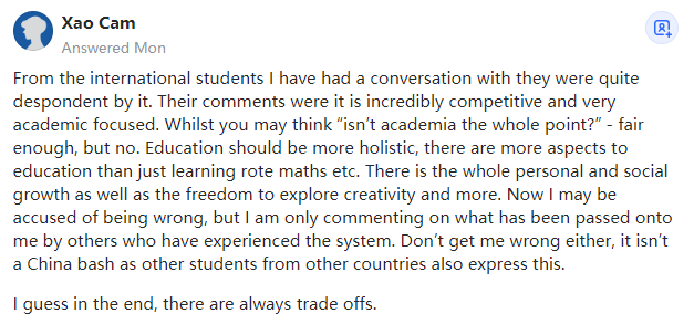 从我与之交谈过的国际学生那里得到的信息是他们对此相当失望。他们的看法是这种竞争令人难以置信,而且非常注重学业。虽然你可能会认为“学业难道不该是重点吗?”——这个问题有些道理,但并非如此。教育应该更全面一些,教育有更多的方面而不仅仅是死记硬背等,教育应该包含个人和社会的发展以及探索创造力的自由等。现在我可能会被指责我的看法是错误的,但我只是在评论那些经历过这个教育体系的人传递给我的东西。也别误会我的意思,其他国家的学生也表达了这一点,这并不是对中国的抨击。