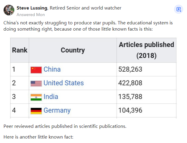 我不知道其他学科的情况,但生物学中的所谓中国“发表的经过同行评议的论文”绝对是垃圾,所以他们发表了更多的论文其实并不那么令人印象深刻。