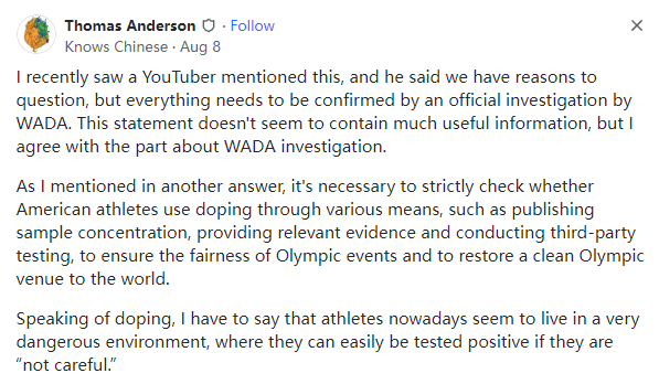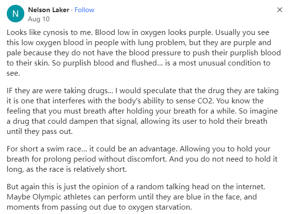 为什么美国游泳运动员的脸又红又紫?这需要一个合理的解释......本文译自Quora,原标题:Why US swimmers’ faces are so red and purple?Need a legit explanation for this…?在我看来,这像是紫绀(cynosis),缺氧的血液呈紫色。通常,肺部有问题的人会出现这种低氧血症,他们脸色发紫、苍白是因为他们没有足够的血压将发紫的血液推向皮肤。因此,血液发紫、面色潮红......这是非常不常见的情况。如果他们服用了药物... 我猜想他们服用的药物会干扰人体感知二氧化碳的能力。你了解憋气一段时间后必须呼吸的感觉,想象一下,有一种可以抑制这种信号,让使用者憋气直到昏迷的药物。对于短距离游泳比赛来说......这可能是一个优势,因为它可以让你在长时间憋气时不会感到不适。而且你不需要屏住呼吸太久,因为比赛的时间相对较短。不过,这也只是网络上一个随口说说的人的看法。也许奥运会运动员可以一直憋气,直到脸色发青而不会因为缺氧而晕倒。老兄,菲尔普斯的肺活量是12升,是正常人6升的两倍。这些游泳运动员日复一日地接受训练,他们的肺活量比我们正常人要大。为什么他们只有在比赛时才会发紫?为什么其他游泳运动员就不会呢?他们是低血压的受害者,所以世界反兴奋剂机构对他们的检查最少(开玩笑的)。为什么只有美国游泳运动员会这样,其他国家的游泳运动员就没有这样的问题?我觉得这里面有猫腻!普通人游泳后可能会面色发紫,因为他不经常运动,但专业游泳运动员(尤其是世界顶尖选手)游泳后绝不会发紫,因为他们每天都在训练,除非他们服用了某种药物。这种现象只发生在美国游泳队身上,其他来自不同国家的游泳队同样游得很卖力,所以这并不是血氧饱和度低现象。美国人对中国游泳队进行了几百次(600?)检测,结果都是阴性。美国队这次没有接受测试,他们过去曾多次被检测呈阳性,但他们归咎于与女朋友亲吻、在食堂吃肉、躺在父亲的床上等。哈哈哈哈,这是个为自己洗脱罪名的好办法。现在他们成了受害者,哇,血压低!!75%的美国运动员都在服用哮喘药,要么他们应该参加残奥会,要么他们都在服用兴奋剂。哈哈哈哈。我是在指出紫脸可能是因为什么,它可能实现的机制以及它可能是滥用药物提高运动员成绩的副作用。会不会是反过来呢?比如通过促进血液循环来改善氧气供应的药物。我最近看到一个Youtube网友提到了这个问题,他说我们有理由质疑,但一切都需要世界反兴奋剂机构(WADA)的官方调查来证实。这句话似乎没有包含太多有用的信息,但我同意关于世界反兴奋剂机构调查的部分。正如我在另一个答案中提到的,有必要通过公布样本浓度、提供相关证据、进行第三方检测等多种手段来严格核查美国运动员是否使用兴奋剂,以确保奥运赛事的公平公正,还世界一个干净的奥运赛场。说到兴奋剂,不得不说现在的运动员似乎生活在一个非常危险的环境中,“一不小心”就很容易被检测出阳性。这是美国花样游泳运动员卡莉斯塔-刘(Calista Liu),她在巴黎奥运会前检测呈阳性,但她仍被允许参赛。美国反兴奋剂机构试图让我们相信她检测呈阳性的原因是有一天她把脸趴在爸爸的枕头上,吃了爸爸的眼药水。有这样离奇经历的不止她一个。法国击剑运动员伊索拉-蒂布斯(Ysaora Thibus)也曾在赛前兴奋剂检测中出现异常,但她侥幸逃脱了处罚并得以参加巴黎奥运会,她的阳性结果的原因似乎是被伴侣意外污染。具有讽刺意味的是西方机构和媒体不遗余力地让我们相信这些离奇的故事,却对世界反兴奋剂机构早已证明了中国运动员的清白的中国运动员食用受污染食品提出一系列“质疑”。现在他们又开始炒作世界反兴奋剂机构“不公正”和“掩盖事实”。但不管他们怎么说,谁会相信美国反兴奋剂机构和他们的“爸爸的枕头”呢?谁有双重标准,谁在用政治操纵污染这项运动,一目了然。如果我的检测结果呈阳性,我的借口会是我张着嘴睡觉,一只壁虎把粪便掉进了我的嘴里,而它在前一天吞下了我姐姐的哮喘药片。美国奥委会应该受到调查,因为它这么快就要求调查其他人,美国游泳队员脸上的颜色绝不是天生的。那个法国运动员的伴侣一定具有放射性,因为他会像花朵授粉一样分泌化学物质。我对西方国家的敬意已经荡然无存,他们如此糟糕的体育精神让他们丧失了所有道德标准。只要披露一下谁因为各种“疾病”而被豁免服用禁药就清楚了,网上说美国队有65%的人患有哮喘,但他们的病在退役后会自动痊愈。他们因为内疚而面红耳赤。他们为使用兴奋剂战胜无辜的队伍,还要表现得欣喜若狂而感到羞愧。挑剔、规则和更多的规则只会导致比赛更加政治化。管它呢,向所有有资格参加比赛的人开放比赛。如果他们想给自己下药,那就下药吧;让它成为所有人的自由。毕竟,为什么只有那些天赋异禀、能负担得起更好营养的人才能参加比赛呢?至于美国,美国想要控制和定义整个世界及其内容,它们认为允许其他机构控制和管理美国运动员/公民侵犯了美国的主权。不仅仅是体育作弊。美国每天都在全面丧失道德底线,只有世界上最强大的宣传机器在延缓这一进程。美国人民是世界上被X脑最严重的群体,没有什么比美国是“例外”国家这一可笑的说法更能说明这一点了。