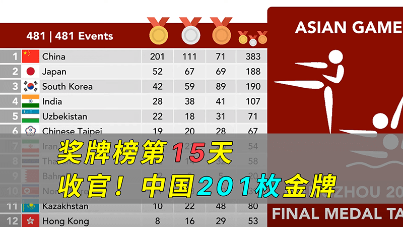 油管热议杭州亚运会第15天奖牌榜:收官!中国201枚金牌屠榜,印度第4!本文译自Youtube,原标题:2023 Asian Games Hangzhou | Final Medal Table | 8 October (Day 15) #asiangamesFinal Medal Tally for the Asian Games 2023 in Hangzhou (China) after Day 15 (8 October 2023)China with over 200 gold medals won the overall medal race in front of Japan and South Korea. India with a great performance in the last view days got into 4th place. Uzbekistan performed amazing and got into 5th place.2023年杭州(中国)亚运会第15天(2023年10月8日)后的最终奖牌榜。