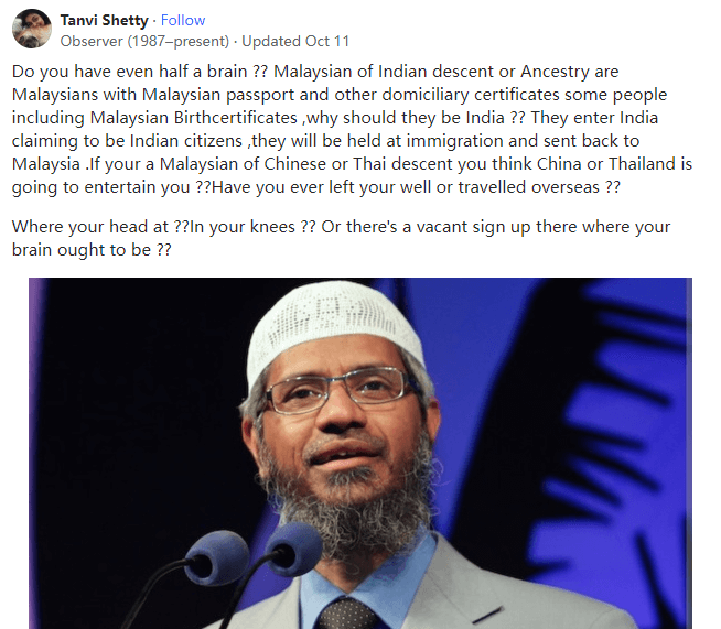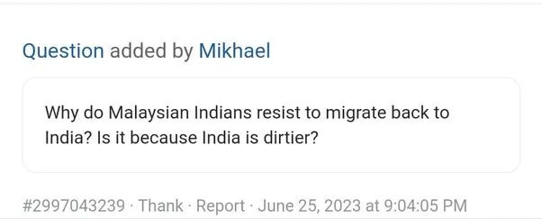我拥有马来西亚公民身份,我的祖父母在印度没有任何个人地址,所以你怎么会觉得我们能够简单地移民到另一个国家?我不会区分印度南方人或北方人。对我们来说,每个人都是一样的。大多数印度裔马来西亚人不懂印地语,我们也与仇视印地语的人没有关系。马来西亚有旁遮普语、马来语、泰卢固语、信德语和泰米尔语的使用者,他们认为自己是马来西亚的印度裔马来西亚人。我是海外的马来西亚人,在马来西亚是印度裔。我并不担心,因为马来西亚外交部(Wisma Putra)一直在维护我和我在海外的家人的权利。马来西亚外交部比我们的南方邻国或西方的小丑要好得多,不管政府里有多少首相和白痴议员,对我们大多数人来说,这才是最重要的,我很荣幸能出生在这里,但有一点要注意--我不会因为被“允许”生活在这里而“心存感激”......