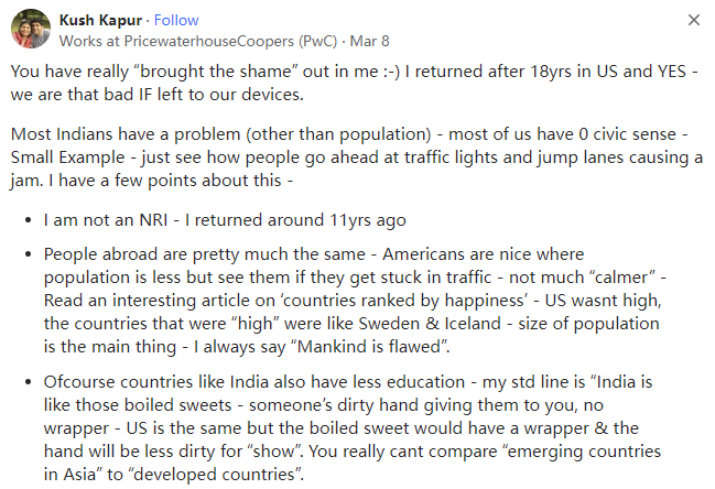 Quora:许多外国人取笑印度,说印度很脏,印度人不讲卫生。我们真的有那么糟糕吗?本文译自Quora,原标题:Many foreigners make fun of India by saying India is dirty and Indians are unhygienic. Are we really that bad?我知道你的这个回答会招来很多人的讨厌,但几乎每个人都知道你说的是他们亲身经历过的事实!我想说果阿这样的省份是个例外,即使喀拉拉邦和泰米尔纳德邦也很脏。在金奈,如果你是女性,你会被人盯着看,你会很不自在。非常正确。根据经验,从果阿往下的西海岸的卫生状况还可以,东海岸很脏,北方的大多数人不知道卫生的概念。与城市和城镇的脏乱差相比,乡村的脏乱差实际上要少得多。这是一个平衡的回答。我明白您的想法,问题在于人们一概而论地认为印度所有的东西、所有的地方都是肮脏的,而事实并非如此。在有些地区/城市,我们可以看到干净整洁、维护良好的东西,而其他地区则不然。我来自班加罗尔,当我第一次去Vrindavan时,我发现路上污水横流,垃圾随处可见。如果圣地都是这样,我可以想象其他我没有去过的小城镇会是什么样子。作为一名海外印度人,由于这个原因我不会回印度,因为一旦你看过西方国家的清洁标准,你就很难再降低标准了。人口多、贫穷的地方比人口稀少、富裕的地方更脏。在喀拉拉邦和果阿邦,旅游业的发展激励他们保持清洁。兄弟,你没有冒犯印度人。印度的街道很脏,有露天的下水道,路边有垃圾等等,这是事实。我希望我们的政府能对此做些什么。印度人根本不尊重公共设施,也没有公民责任感。印度非常注重个人卫生,人们会保持自己和房屋的干净整洁,这一点不容置疑,但我们还没有学会把这一点带到外面去。那些在公共场所寻找垃圾桶丢弃包装纸或垃圾的海外侨民并没有避免在印度街头乱扔垃圾。印度政府在这方面确实尽了最大努力。举个例子:印度铁路公司花费了大约120亿卢比来清理火车内和周围的槟榔及香烟的污渍。如果人们在这方面表现出一定的公德心,这笔费用可能会少得多。Former Member at Consumer Court几年前,我们去了新加坡。我们一行11人,包括3个孩子。我们去了一个叫圣淘沙岛的地方,当我们在该地区散步时,其中一个孩子把一包空薯片扔到了人行道上。过了一会儿,一个在该地区工作的当地人拦住了我们,粗鲁地对我们说:“把这个垃圾捡起来,这里不是印度”。我们立即捡了起来并向他说了声抱歉,但听了这番话后,我们感到非常尴尬。马路的对面住着一户相当富裕的人家。每天早上,他们的一个女佣都会从家里出来,把垃圾扔到路边的角落里,她从来不等垃圾清运车过来。虽然我们倾向于保持房屋整洁,也注意个人卫生,但我们在保持街道、道路和周围环境整洁方面却做得很差。事实上,我们根本不在乎这些。Software Developer,Lives in Bengaluru, Karnataka, India在印度生活时,我经常在当地的南印度餐馆吃饭。通常,当我住在高档的中产阶级地区时,这从来不是问题,因为我在拉贾金纳加尔(Rajajinagar)生活了二十年,我经常光顾那里的餐馆,没有一次生病。但在Thanisandra,情况就大不一样了。在浦那,情况就大不相同了。由于印度食物的制作方法不卫生,我曾多次食物中毒。人们在烹饪时不遵守基本的最佳做法:烹饪前洗手,在干净的石板上用干净的餐具切菜。在印度,这些做法很多都不存在。不讲究卫生是印度文化中公认的一部分,这让几乎所有的其他文化,包括墨西哥这样的第三世界发展中国家都感到震惊。在美国的3个月里,我连胃病都没有得过,那里的人们都非常讲卫生。差异和证据非常明显,不讲卫生只是印度文化的一部分。不是不讲卫生,而是饮食习惯改变了。我在巴西时也遇到过类似的情况,胃不舒服,主要原因是因为我们喝的水。我儿子每次回来,我们都不让他喝自来水,几天后,他就好了。他是在美国定居的印度人。食物中毒的发生是因为食物不卫生,而不是因为食物的种类不同。我们的身体可以承受多种类型的食物。胃部不适与食物中毒也有很大区别。我在南美也得过类似的病,你们管这叫食物中毒吗?我不得不去看医生。南美也不太干净。就像如果你去墨西哥,人们总是建议你不要随便吃餐馆里的食物,因为要么你会食物中毒,要么你吃了猪肉可能会感染寄生虫。最好小心谨慎,要求饭菜做得很熟。我一般不吃冷饭和沙拉。水也是另一个问题。Works at PricewaterhouseCoopers (PwC),Lives in New Delhi你真的让我“羞愧难当”:-) ,我在美国呆了18年后回国,是的,如果任由我们自己发展,我们就是那么糟糕。大多数印度人都有一个问题(除了人口以外)--我们大多数人都没有公民意识--举个小例子--看看人们是如何在交通信号灯前抢行和跳道造成拥堵的就知道了。对此我有几点看法:我并不是非常住印度居民(NRI)--我大约11年前就回国了。国外的人都差不多--美国人在人口较少的地方很好,但如果遇到交通堵塞,你会看到他们--“平静”不了多少--我读过一篇关于“幸福感国家排名”的有趣文章--美国并不高,“高”的国家是瑞典和冰岛--人口数量是主要因素--我总是说“人类是有缺陷的”。当然,像印度这样的国家教育程度也较低--我的口头禅是“印度就像那些煮熟的糖果--有人会用脏手拿给你吃,没有包装”--美国也是一样,但煮熟的糖果会有包装,而且为了“炫耀”,手不会那么脏。你确实不能把“亚洲新兴国家”与“发达国家”相