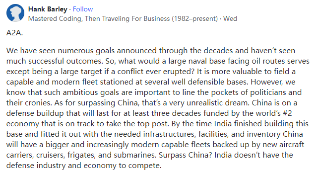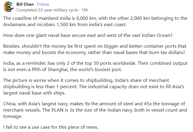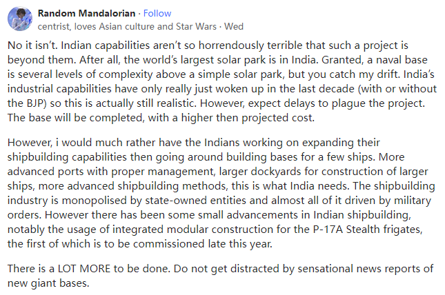 不,没有。印度的能力并没有可怕到让这个项目超出他们的能力范围。毕竟,世界上最大的太阳能公园就在印度(译注:巴德拉太阳能公园,位于印度垃圾斯坦邦)。诚然,一个海军基地比一个简单的太阳能公园要复杂得多,但你明白我的意思。印度的工业能力在过去十年才真正觉醒(无论有没有印度人民党),因此这实际上仍然是现实的。然而,预计延误将困扰该项目,虽然基地最终会完工,但成本会高于预期。