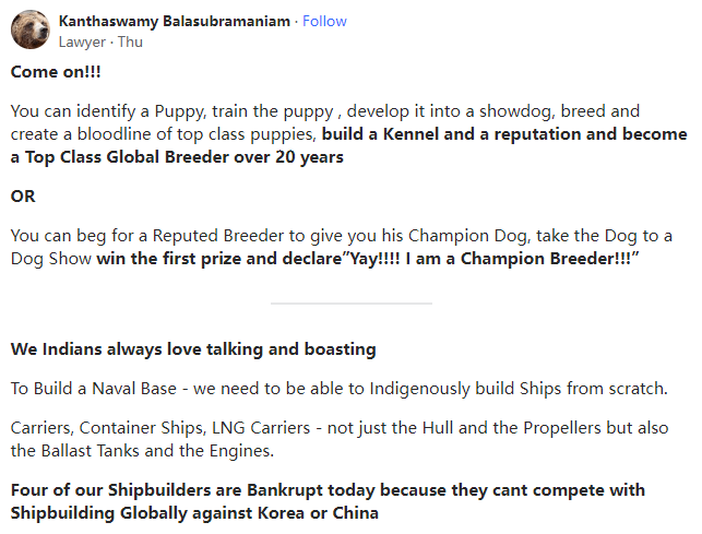 然而,我更期待印度人努力扩大他们的造船能力,而不是为几艘船到处去建基地。更先进的港口和适当的管理,更大的造船厂,更先进的造船方法,这些才是印度所需要的。印度的造船业由国有实体垄断,几乎所有的造船业都是由军事命令驱动的。不过,印度造船业也取得了一些小的进步,尤其是P-17A隐形护卫舰采用了集成模块化结构,其中第一艘将于今年晚些时候投入使用。