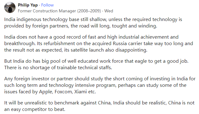 任何外国投资者或合作伙伴都应该研究在印度投资这种长期和技术密集型项目的短期前景,或许它们可以研究一下苹果、富士康、小米等公司在印度面临的一些问题。