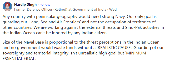 任何拥有半岛地理环境的国家都需要强大的海军。我们唯一的目标是保卫我们的“陆、海、空边境”,而不是占领其他国家的领土。我们正在努力应对外部威胁,任何印度公民都不能忽视中巴在印度洋的活动。