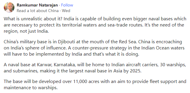 有什么不现实的?印度有能力建设更大的海军基地以保护其领海和海上贸易路线,这是该地区而不仅仅是印度的需要。