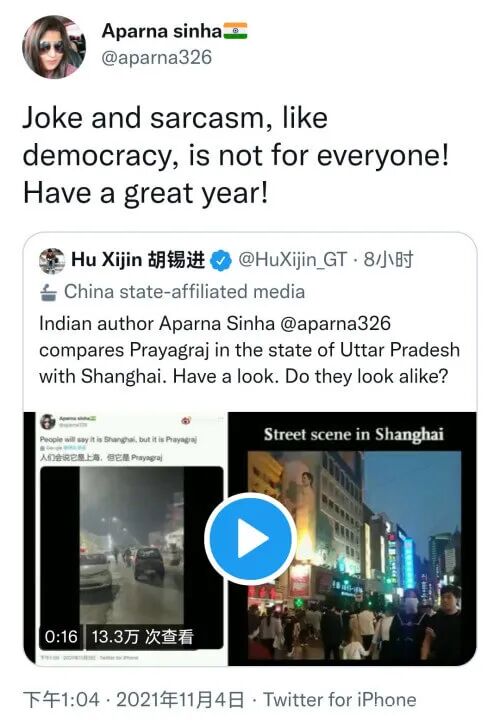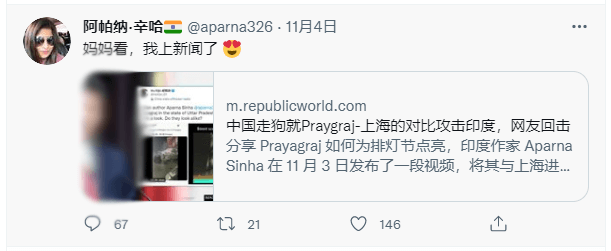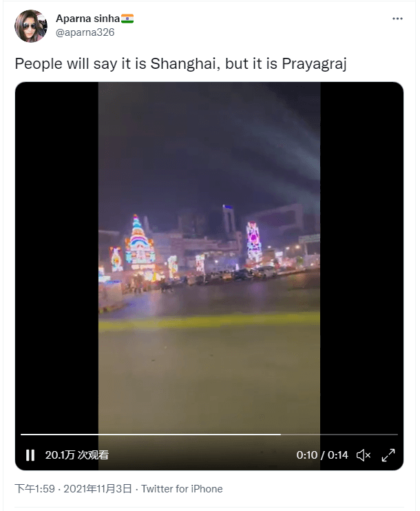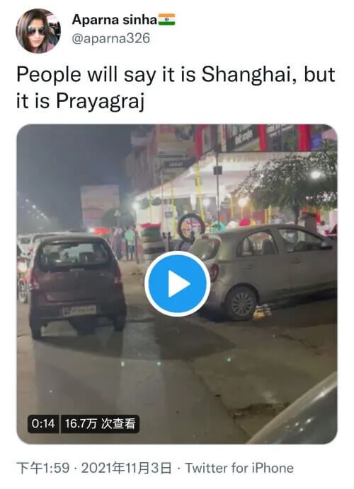 网文来自网友原文翻译投稿,所有言论皆不代表本站立场 | 本文文字/图片来自网络,侵删 | 点击页眉也可刷新 | 本文内容仅供娱乐,不作任何严肃之用途上海成标杆了?印度作家把Prayagraj比作上海引发网友热议当地时间11月3日,名叫阿帕纳·辛哈,自称是印度女作家的一名推特用户在其个人推特上发布一则有关印度城市安拉阿巴德的夜景视频。画面中的人并不多,但街道上仍传来些许嘈杂声,一些汽车、摩托和三轮车驶过镜头,街面上的房屋看起来并不高大,但街边建筑时而射出的黄色灯光还是给夜晚增添了一些热闹的气氛。不过,这名用户却主动配文cue了一把上海:“人们会说这是上海,但这是安拉阿巴德。”环球时报主编胡锡进已经发推,询问其账号关注者:安拉阿巴德和上海像吗?这位印度女作家回:笑话和讽刺,就像民|主一样,并不适合所有人!过个美好的一年!目前,这事已经上了推特印度版的热搜,感觉被这位印度女作家碰瓷到了。点开这位女作家的亚马逊主页,里面有几本书出售,都是偏军事类的,评价较少,估计这次目的就是为了碰瓷吧,看来现在目的达到了。