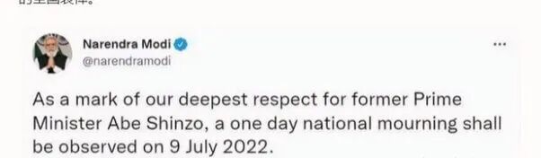 除了在推特上表达哀悼外,莫迪还决定设立全国哀悼日,并在全国各地降半旗哀悼安倍晋三遇刺事件。