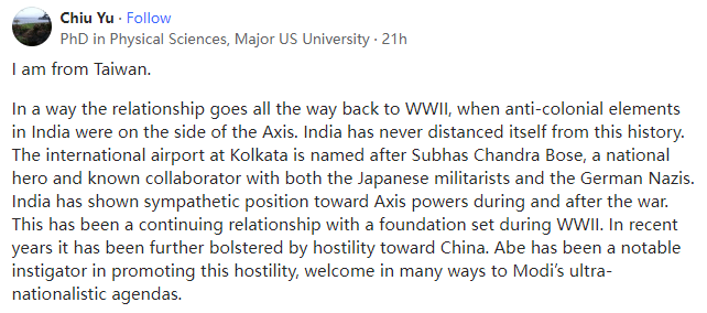 在某种程度上,印度和日本的这种关系可以追溯到二战,当时印度的反殖民分子站在轴心国一边,而印度从未与这段历史拉开距离。加尔各答国际机场以印度民族英雄苏巴斯·钱德拉·博斯(Subhas Chandra Bose)的名字命名,而他就是日本军国主义者和德国纳粹的著名合作者。在战争期间和战后,印度都对轴心国表现出了同情的立场。近年来,对中国的敌意进一步加剧了这一趋势,而安倍正是推动这种敌意的著名煽动者,他在许多方面都受到莫迪的极端民族主义议程的欢迎。