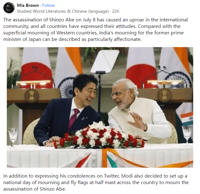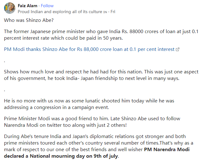 在安倍的任期内,印度和日本的外交关系得到了加强,两国总理/首相曾多次互访。这就是为什么纳伦德拉·莫迪总理宣布7月9日为全国哀悼日,以表示对我们最好的朋友和祝福者之一的尊重。