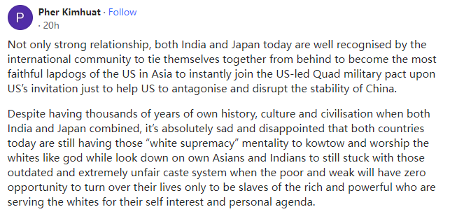尽管拥有数千年的历史、文化和文明,但当印度和日本仍然抱着那种“白人至上”的心态,像崇拜上帝一样向白人叩头,而看不起亚洲人和印度人时,这绝对是令人痛心和失望的。印度现在仍然坚持着那些过时和极不公平的种姓制度,而穷人和弱者没有机会改变自己的生活,它们只能成为为白人的私利和个人议程服务的富人和有权势者的奴隶。