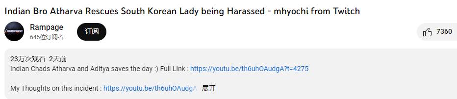 韩国女主播印度直播遭猥亵,印网友疑其故意清凉装撩骚勾引印度男性引流本文译自Youtube,原标题:Indian Bro Atharva Rescues South Korean Lady being Harassed - mhyochi from Twitch印度外交部发言人表示,地方当局将为这位韩国游客提供保护。Hyojeong Park接受印媒采访时,称赞孟买警方的行动非常迅速,表示她还将继续在当地多停留一段时间。Hyojeong Park说,这段被骚扰的经历可能会让别人认为印度不是一个女性能够安全旅游的国家,但不会改变她对印度的看法。她仍然热爱印度这个国家,并希望向其他人展示印度的美好,“这事破坏了我(对印度)的印象,但我还会再来的。”据印媒报道,当地时间11月30日,24岁的韩国女主播Hyojeong Park于深夜在印度孟买街头直播,当着直播间里1000多名观众的面,她遭遇两名印度男子毛手毛脚的骚扰行为。视频显示,其中一名男子突然抓住Hyojeong Park的手,试图将其拉到自己的摩托车上,她一直在闪躲。未料男子竟凑上前要强吻,吓得Hyojeong Park迅速撇开头,拉开两人距离,慌张地连喊了好几声:“不不不!”(NO!NO!NO!)Hyojeong Park随后跑开,但对方仍不罢休,载着朋友骑着摩托车追了上来,再次对其展开骚扰。最后在好心人的帮助下,Hyojeong Park才成功逃离。Incident goes Viral in India. The accused have been identified as Mohammad Shaikh (19) and Mohammad Naqib Sadarialam Ansari (20) has been arrested by the Mumbai Police. Apparently "Atharva Tikkha" the gentleman who was watching her livestream immediately came outside to save her from the thugs who were now following her on the bike.His name Atharva was revealed when Mhyochi livestreamed with him in her twitch channel. Mhyochi revealed his IG: @atharvatikkhaSome very disturbing and racist comments have come in. The age old trope of Every 15 minutes a girl gets raped in India. Okay! Let us calculate how many minutes a girl gets raped in the US or UK especially London. In the U.S in absolute numbers, the rapes are at astonishingly 100,000 every year, that means a girl gets raped every 5.45 minutes.Now if you calculate the every 15 minutes a girl gets raped in India narrative, the number comes to around 35,040 RAPES EVERY YEAR, in a country of 1.4 Billion people. Even in absolute numbers Indian rapes are smaller than U.S a country 1/4 the population of IndiaThats how you manipulate a stat and portray your narrative, thats who you also malign India's "DEMOCRACY" by playing with numbers and manipulating it, Salvatore Babones recently showed why the West is trying to portray Indian democracy as FAILING. India is still a developing country and its a miracle its a thriving democracy in the Indian subcontinent whose neighbours aren't democractic. India has free press and gets to report everything unlike CHINA. India needs Police reforms and Judicial reforms, Lets be honest, even if she called for the police ,the police would definitely wouldnt reach her ASAP, unlike say in the west where the response rate is Quick.India needs a whole bunch of reforms to ensure accountability and transparency and most importantly invest in humans aka Police to deal and handle such situations and a accountable judiciary which makes sure to punish the criminals and not let them go scot free.该事件正在印度广泛传播。被告已被确认为穆罕默德·谢赫(Mohammad Shaikh,19岁)和穆罕默德·纳齐布·萨达里亚姆·安萨里(Mohammad Naqib Sadarialam Ansari,20岁),他们现已被孟买警方逮捕。据我们所知,正在观看她直播的绅士Atharva Tikkha很快来到了外面并将她从骑着摩托车跟踪她的暴徒手中救了出来。他的名字 Atharva是 Mhyochi 在她的 twitch 频道中与他直播时透露出来的。Mhyochi 透露了他的 IG:@atharvatikkhahttps://www.twitch.tv/videos/16680156...评论区出现了一些非常令人不安和种族主义的评论。他们有一个古老的说法,说在印度每15分钟就有一名女孩被强奸。让我们计算一下一个女孩在美国或英国(尤其是伦敦)被强奸所需的时间。美国每年强奸案的绝对数量达到了惊人的10万起,这意味着每5.45分钟就有一名女孩被强奸。如果印度故事中每15分钟就有一名女孩被强奸,那么在一个拥有14亿人口的国家,这个数字每年约为35040起。即使在绝对数字上,印度强奸案数量也比美国更少,而美国的人口只有印度的四分之一。Salvatore Babones最近向我们展示了西方试图将印度民主描绘为失败的原因,它们通过玩弄数字和操纵叙事来诋毁印度。印度仍然是一个发展中国家,印度次大陆的民主国家正繁荣发展而其邻国并不民主,这是一个奇迹。与中国不同,印度拥有新闻自由,它可以报道一切。印度需要警察改革和司法改革,老实说,即使她报警,警方肯定也不会像西方国家的反应速度那样尽快联系到她。印度需要进行一系列改革以确保问责制和透明度,最重要的是投资于处理此类情况的人(警察)以及确保惩罚罪犯而不让他们逍遥法外的负责任的司法机构。