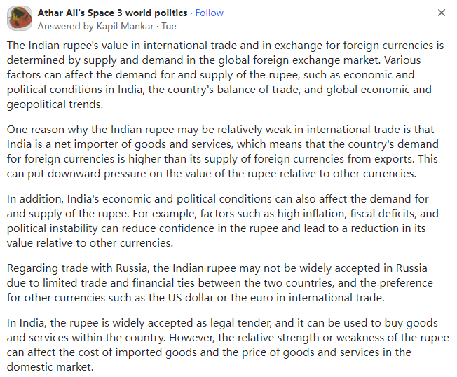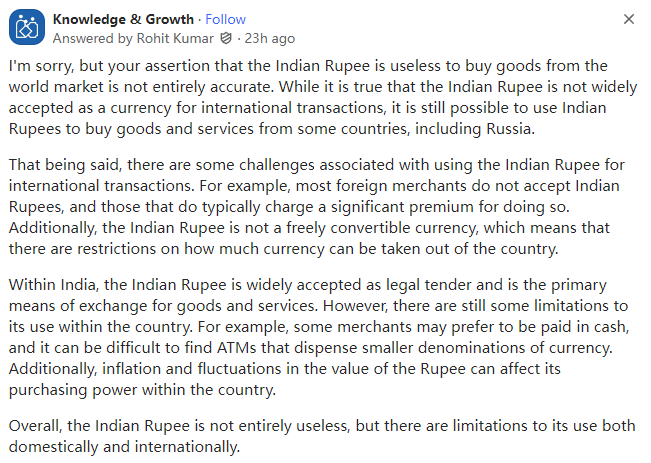 俄罗斯暂停接受印度卢比,为什么印度卢比在世界贸易中毫无用处?本文译自Quora,原标题:It is well-known that Indian Rupee is useless to buy any goods from the world market. But Indian Rupee can't even be used to buy any goods from India, such as Russia. Why is Indian Rupee useless in the world including in India?海外网5月4日电据路透社4日报道,两名印度官员表示,俄罗斯和印度已暂停以卢比结算双边贸易的谈判,俄方认为持有卢比“不划算”。一位印度政府官员说,由于贸易逆差对俄罗斯有利,俄方认为,如果制定出卢比结算机制,俄罗斯最终将出现超过400亿美元的年度卢比盈余,这对俄罗斯来说绝对“不划算”。另一位参与讨论的印度政府官员表示,俄罗斯不愿意持有卢比,希望以人民币或其它货币支付双边贸易。卢比不能在多国进行完全兑换。印度在全球商品出口中的份额也仅为2%左右,这些因素降低了其他国家持有卢比的必要性。对于从俄罗斯进口廉价石油和煤炭的印度进口商来说,暂停以卢比结算双边贸易这将是一个重大挫折,进口商正等待卢比支付机制以帮助降低货币兑换成本。avid reader, formerly employed ,Indian citizen since birth印度货币被称为卢比,卢比的价值受到通货膨胀率、外汇制度等各种因素的影响。印度卢比疲软的主要原因是贸易赤字不断增加、外国投资者缺乏信任以及股市萎缩。同意以印度卢比进行贸易的国家包括尼泊尔、不丹、缅甸、斯里兰卡、马尔代夫、阿拉伯联合酋长国、伊朗、伊拉克、也门、巴林、阿曼、卡塔尔、沙特阿拉伯、叙利亚、约旦、黎巴嫩和埃及。印度商务部的数据显示,在工程产品、药品和制药以及有机和无机化学品的带动下,印度2月份对俄罗斯的出口额较上月激增25%,达到了3.3758亿美元($337.58 million)。很抱歉,你认为印度卢比对从世界市场购买商品毫无用处的说法并不完全准确。虽然印度卢比确实没有被广泛接受为国际贸易的货币,但使用印度卢比从包括俄罗斯在内的一些国家购买商品和服务仍然是可能的。话虽如此,在使用印度卢比进行国际贸易方面确实存在一些挑战。例如,大多数外国商人不接受印度卢比,而那些接受印度卢比的商人通常会收取高昂的溢价。此外,印度卢比不是一种可自由兑换的货币,这意味着可以带出该国的货币的数量受到限制。在印度,虽然印度卢比被广泛接受为法定货币,是商品和服务的主要交换手段。然而,它在国内的使用仍存在一些局限性。例如,一些商家可能更喜欢用现金支付,但很难找到能取较小面额货币的自动取款机。此外,通货膨胀和卢比价值的波动会影响其在国内的购买力。总的来说,印度卢比并非完全无用,但其在国内外的使用都有局限性。印度卢比在国际贸易和外汇兑换中的价值由全球外汇市场的供求关系决定。各种因素都会影响卢比的需求和供应,如印度的经济和政治状况、该国的贸易平衡以及全球经济和地缘政治趋势。印度卢比在国际贸易中可能相对疲软的一个原因是印度是商品和服务的净进口国,这意味着该国对外币的需求高于出口对外币的供应,这可能会给卢比相对于其他货币的价值带来下行压力。此外,印度的经济和政治状况也会影响卢比的需求和供应。例如,高通胀、财政赤字和政治不稳定等因素可能会降低人们对卢比的信心并导致卢比相对于其他货币的价值下降。关于与俄罗斯的贸易,由于两国之间的贸易和金融关系有限,以及在国际贸易中对美元或欧元等其他货币的偏好,印度卢比可能不会在俄罗斯被广泛接受。在印度,卢比被广泛接受为法定货币,可以用来在国内购买商品和服务。然而,卢比的相对强弱可能会影响进口商品的成本以及国内市场商品和服务的价格。Former Project Manager at Deutsche Softwares Ltd (2001–2012),Lives in Bengaluru, Karnataka, India前德意志软件有限公司项目经理(2001-2012年),生活在印度卡纳塔克邦班加罗尔我在许多国家旅行过,在每一个愚蠢的批发折扣店都使用过我的印度信用卡,不存在任何问题。除了国际机场的免税商店外,别的国家不会接受任何外国货币(他们只接受一篮子货币,因为他们知道如果他们去兑换货币,他们将在预期范围内获得报酬-为什么?因为这些货币是流动的-这意味着它们总是在大量交易)。如果你想让印度卢比与国际贸易货币等量齐观,那么就提高你的生产力,这样你就可以消费更多的商品和服务并生产与国际品牌不相上下的商品和劳务了。我相信你的问题存在误解。印度卢比(INR) 是印度的官方货币,它无疑可以用来在国内购买商品和服务,因此它在印度并非“无用”。然而,印度卢比作为一种在印度以外的支付方式并没有被广泛接受。当您提到“俄罗斯”时,我想您的意思是问为什么不能使用印度卢比在俄罗斯等国家/地区购物。通常,每个国家/地区都有自己的官方货币,并且该国家/地区内的交易通常使用该货币进行。就俄罗斯而言,其官方货币是俄罗斯卢布(RUB)。人们在国际旅行或开展业务时,通常需要将自己国家的货币兑换成他们正在访问或开展业务的国家/地区使用的货币,这是因为大多数企业和个人更喜欢使用他们自己的货币进行交易,因为它对他们来说是熟悉且更稳定的。有一些货币(如美元 (USD) 和欧元 (EUR))因其稳定性和背后经济体的规模而被广泛接受并用于国际交易,但印度卢比不是这些被全球接受的货币之一,因此您需要将卢比兑换成当地货币