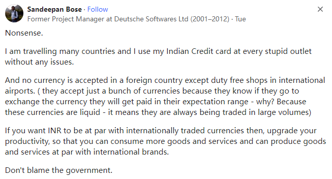 来源:https://www.quora.com/It-is-well-known-that-Indian-Rupee-is-useless-to-buy-any-goods-from-the-world-market-But-Indian-Rupee-cant-even-be-used-to-buy-any-goods-from-India-such-as-Russia-Why-is-Indian-Rupee-useless-in-the-world-including
