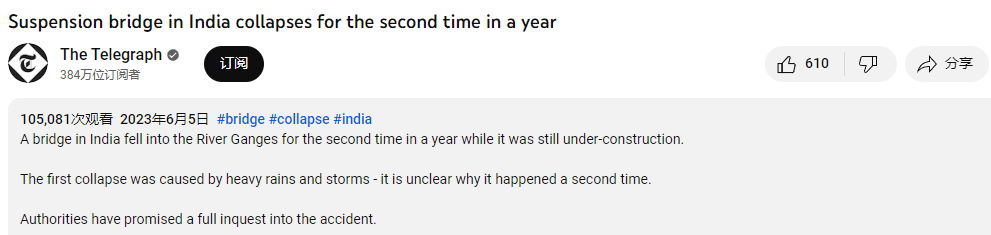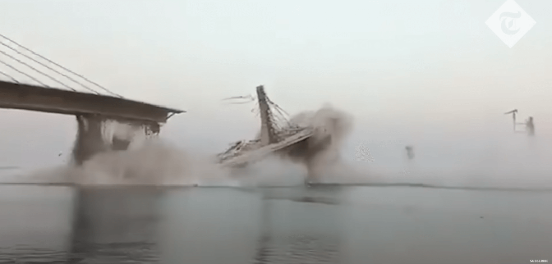 网文来自网友原文翻译投稿,所有言论皆不代表本站立场 | 本文文字/图片来自网络,侵删 | 点击页眉也可刷新 | 本文内容仅供娱乐,不作任何严肃之用途印度跨恒河大桥二次垮塌:各国网友热议印度制造之质量本文译自Youtube,原标题:Suspension bridge in India collapses for the second time in a year据《今日印度》报道,当地时间6月4日,印度比哈尔邦在建的横跨恒河的阿格瓦尼-苏丹甘吉大桥再次发生坍塌,现场的目击者拍下了坍塌的画面。当地官方称目前无人在事故中伤亡。比哈尔邦首席部长尼蒂什·库马尔下令对倒塌事件进行调查,并要求找出事件的责任人。去年,该桥也曾发生过坍塌。大桥再次坍塌引发了人们对建筑材料质量的质疑。据悉,这座桥耗资171亿卢比(约14.7亿元人民币),总长度3.1公里,原本预计将在11月至12月左右落成。