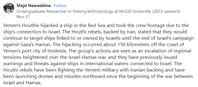 Undergraduate Researcher in history/anthropology at McGill University (2022–present)麦吉尔大学历史/人类学本科生研究员(2022年至今)也门胡塞叛军在红海劫持了一艘商船,并因该船与以色列有联系而将船员扣为人质。得到伊朗支持的胡塞叛军表示他们将继续袭击与以色列人有关或以色列人拥有的船只,直到以色列对加沙地带的哈马斯的行动结束。劫持事件发生在距离也门港口城市荷台达海岸约150公里处。该组织的行动被视为因以色列-哈马斯战争而加剧的地区紧张局势的升级,他们此前曾对与以色列相关的国际水域的船只发出过警告和威胁。胡塞叛军一直在伊朗的支持下与也门军方作战,自以色列与哈马斯开战以来,他们一直在向北方发射无人机和导弹。
