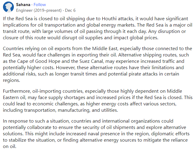 Engineer (2019–present),Lives in Bengaluru, Karnataka, India2023–present工程师(2019年至今),2023年至今生活在印度卡纳塔克邦班加罗尔如果红海因胡塞武装的袭击而关闭石油运输将对石油运输和全球能源市场产生重大的影响。红海是一条主要的石油运输路线,每天都有大量的石油通过那里,这条航线的任何中断或关闭都会扰乱石油供应并影响全球石油价格。