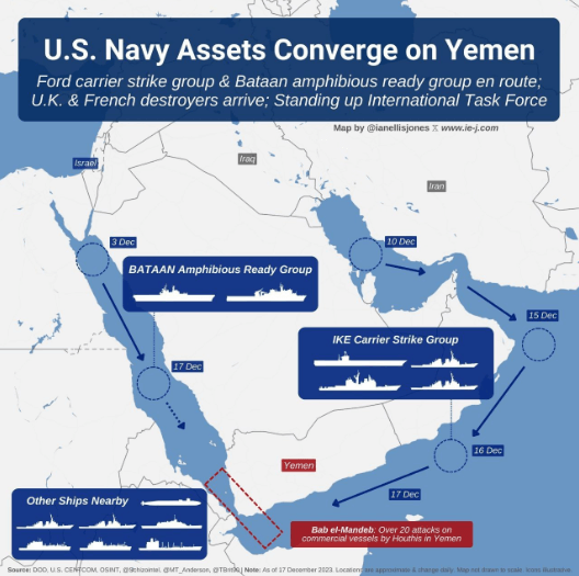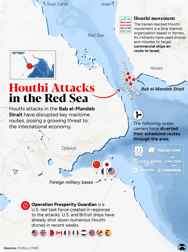 美国组建多国海上联军巡航红海,中国会如何回应?中国会加入吗?本文译自Quora,原标题:How will China and Russia respond to the US and NATO plans in the Red Sea?当地时间18日,美国防长奥斯汀宣布,已组建一支多国海上联军,部署大量海军资产威慑胡塞武装,保护在红海过境的船只。不过,多家媒体注意到,没有一个中东大国公开参与这一联盟。本轮巴以冲突爆发后,也门的胡塞武装第一时间宣布支持哈马斯和巴勒斯坦事业,并表示将打击任何将要前往以色列的船只。近日,胡塞武装显著扩大了行动规模,迫使多家国际航运公司宣布暂停途径红海的航线。全球大约12%航运途径红海,是全球最繁忙的海运路线之一。据美国公布的名单,目前参与这一名为“繁荣卫士”联盟的国家包括美国、英国、巴林、加拿大、法国、意大利、荷兰、挪威、塞舌尔和西班牙十国。美国表示,“繁荣卫士”将采取海面巡逻和防卫行动,以保护红海航行,应对胡塞武装向“通过国际水域的商船发射弹道导弹和无人飞行器的挑战”。西班牙国防部随后于19日否认了参与这一行动,称无法单方面做出该决定。“繁荣卫士”中没有一个国家与红海接壤,其中也只有小国巴林位处中东。