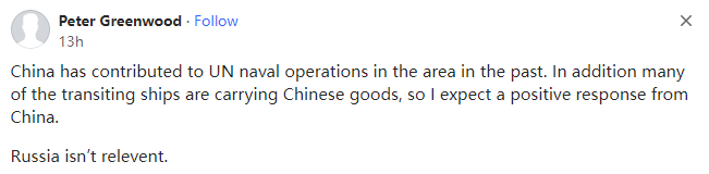 中国过去曾为联合国海军在该地区的行动做出过贡献。此外,许多过境船只都载有中国的货物,因此我预计中国会做出积极的回应。