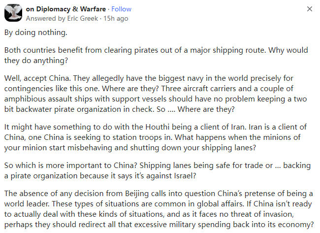 Former Infantry Officer at U.S. Army两国都能从清除主要航道上的海盗中获益,它们为什么要做什么呢?好吧,接受中国吧。据称它们拥有正是为了应对类似突发事件的世界上规模最大的海军。它们在哪里?三艘航空母舰和几艘两栖攻击舰以及辅助舰艇应该可以轻松控制住一个位于穷乡僻壤的海盗组织,那么....它们在哪里?这可能与胡塞武装是伊朗的附庸有关。伊朗是中国的附庸,而中国正在寻求在伊朗驻军。当你的奴才的奴才开始胡作非为并关闭你的航道时会发生什么?对中国来说,哪个更重要?是贸易航道安全还是......支持一个海盗组织,因为它说它反对以色列?中国ZF没有做出任何决定,这让人对中国作为世界领导人的假设产生了质疑。这类情况在全球事务中屡见不鲜,如果中国还没有准备好真正应对这类情况,而且它也没有面临入侵的威胁,那么也许它们应该把过多的军费开支转用于经济建设?在这些问题上真正解决问题要比在一旁平庸地冷嘲热讽困难得多,中国显然还没有做好过渡到实际解决问题的准备。