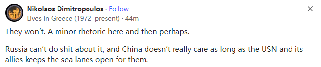 Lives in Greece (1972–present)俄罗斯对此无能为力,而中国也不会真的关心,只要美国海军及其盟国为它们保持海上通道畅通即可。