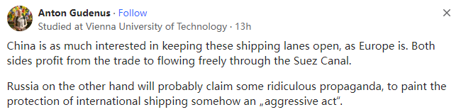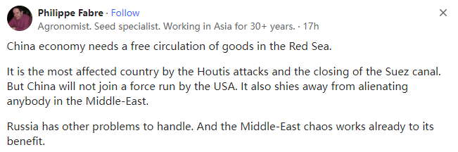Agronomist. Seed specialist. Working in Asia for 30+ years,Lives in Bangkok农学家,种子专家,在亚洲工作了30多年,生活在曼谷中国是受胡塞武装袭击和苏伊士运河关闭影响最大的国家,但中国不会加入由美国主导的势力,中国也不想疏远中东地区的任何人。俄罗斯还有其他问题需要处理,中东的混乱局面对它有利。