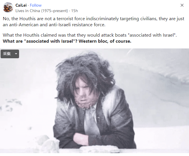 Lives in China (1975–present)不,胡塞武装并非不分青红皂白地针对平民的恐怖势力,它们只是一支反美反以色列的抵抗力量。