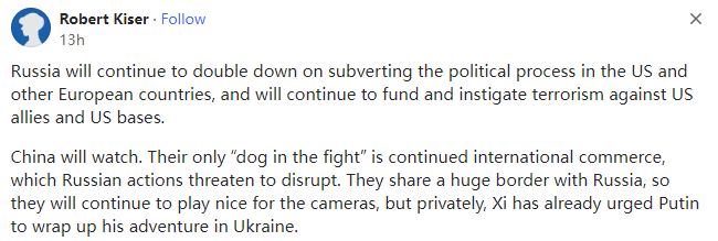 中国将袖手旁观。对它们来说唯一有“利害关系”的是国际商业的持续发展,而俄罗斯的行动有可能破坏国际商业。中国与俄罗斯接壤,所以它们会继续在镜头前装好人,但私下里,习已经敦促普京结束在乌克兰的冒险。