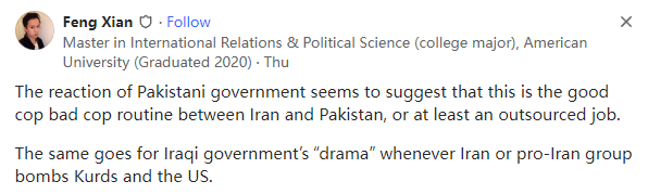 Master in International Relations & Political Science (college major), American University (Graduated 2020)美国大学国际关系与政治学硕士(大学主修)(2020年毕业)巴基斯坦政府的反应似乎表明这是伊朗和巴基斯坦之间的“一个唱红脸,一个唱白脸的把戏”,或者至少是一项外包工作。