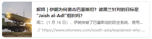 (1) 伊朗外交部长与巴基斯坦外交部长在达沃斯会面并进行了详细讨论。(2) 巴方在其仪式性公告中没有提到哪个营地遭到了袭击,它们只提到了2名儿童和3名女孩死亡,但没有提到一共有多少人死伤。巴基斯坦虽然召回了大使,但要求其驻伊朗大使不要回国。(3) 伊朗声称没有袭击巴基斯坦境内的任何巴基斯坦公民,并声称其袭击的目标是巴基斯坦境内的伊朗人。(4) 就在袭击发生前几天,印度总理在德黑兰会见了伊朗总理。人们普遍认为印度正在支持俾路支省的俾路支解放军和相关组织,其目标是瓜达尔港。(5) 中国已要求伊朗和巴基斯坦双方缓和言辞,这为邻国提供了事态不会升级的保证。