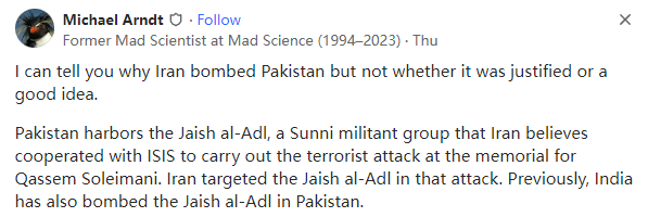我可以告诉你伊朗轰炸巴基斯坦的原因,但不能告诉你这是否合理或者是否是个好主意。