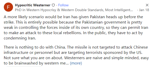 PhD in Western Hypocrisy & Western Double Standards, Most Intelligent Human (Graduated 1900)西方虚伪和西方双重标准博士,最聪明的人类(1900年毕业)更有可能的情况是伊朗在袭击前已经跟巴基斯坦通过气。这是完全有可能的,因为巴基斯坦政府在控制国内势力方面的能力相当薄弱,所以它们会允许伊朗对这些地方叛军发动袭击。但在公众面前,它们必须采取行动谴责伊朗。