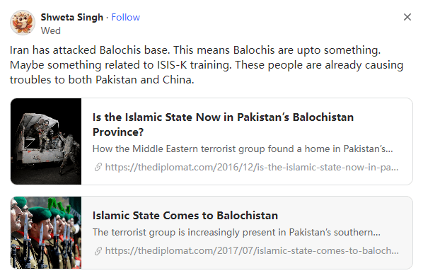 伊朗袭击了俾路支武装的基地,这意味着俾路支人在谋划着什么。也许与ISIS-K的训练有关,这些人已经给巴基斯坦和中国带来了麻烦。