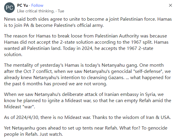 新闻称双方同意联合成为一支巴勒斯坦联合部队,哈马斯将加入巴勒斯坦民族权力机构并成为巴勒斯坦的正式军队。哈马斯之所以脱离巴勒斯坦民族权力机构,是因为哈马斯不接受1967年分裂后的两国解决方案,哈马斯想要所有巴勒斯坦的土地。2024年的今天,他们接受了1967年的两国解决方案。昨天哈马斯的心态就是今天内塔尼亚胡一伙的心态。去年10月7日冲突发生一个月后,当我们看到内塔尼亚胡种族灭绝式的“自卫”时,我们已经知道了内塔尼亚胡清洗加沙人的意图......过去6个月发生的一切证明我们没有错。当我们看到内塔尼亚胡蓄意袭击伊朗驻叙利亚大使馆时,我们就知道他计划挑起中东战争,以便在中东“战争”中清空Refah(译注:加沙地带和埃及之间的通道)。截至2024年4月30日,中东战争没有爆发,这要归功于伊朗和美国的智慧。然而,内塔尼亚胡却继续在Refah附近搭建帐篷。为了什么?他是为了在Refah进行种族灭绝。看着吧。我们很高兴看到沙特和伊朗在2023年实现和解以及随后中东国家出现的团结。我们欢迎哈马斯-巴勒斯坦权力机构在2024年实现联合。1,在美国大学举行大规模的反内塔尼亚胡抗议活动。据《纽约时报》称,抗议活动由犹太裔美国亿万富翁乔治-索罗斯(George Soros)资助。2,拜登考虑对去年10月7日哈马斯袭击之前在约旦河西岸严重侵犯人权的以色列国防军3个营实施制裁......但这是象征性的,因为美国会继续向以色列提供援助。3,纳萨尔医院附近发现了乱葬坑,有些人头部中弹,有些人双手被绑,有些人穿着病号服,有些人可能被活埋,其中有妇女和儿童,联合国人权委员会将调查这是否是战争罪。国际法院应重新审理以色列被指控犯有种族灭绝罪的案件,这次有证据。4,国际刑事法院可能会对内塔尼亚胡及其两名高官发出逮捕令。国际刑事法院的一名法官是英国人,让我们看看他/她是否会坚持正义。中国像一个负责任的世界大国一样致力于和平与和解,而美国却在煽动仇恨和偏执。很明显,中国正在鼓励组建一个统一的巴勒斯坦团队,在两国解决方案中完成向一个完整的巴勒斯坦国的战后过渡。如果不对以色列和哈马斯双方的极端分子加以节制,将导致大屠杀和种族灭绝,而这就是我们正在目睹的悲剧!What do you believe is the significance of China hosting Palestinian unity talks between Hamas and Fatah?