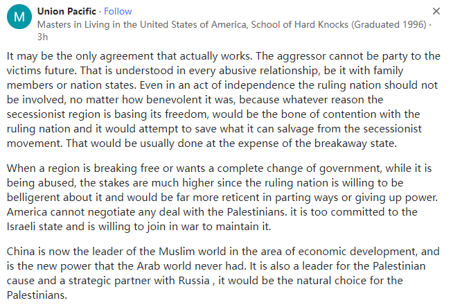 网文来自网友原文翻译投稿,所有言论皆不代表本站立场 | 本文文字/图片来自网络,侵删 | 点击页眉也可刷新 | 注册送50花瓣,每日登录送5花瓣 | 本文内容仅供娱乐,不作任何严肃之用途中国在撮合14个巴勒斯坦派别在北京签署《北京宣言》中发挥了什么作用?这份宣言有什么历史意义?本文译自Quora,原标题:China asked 14 Palestinian factions, including Hamas and Fatah, to sign a declaration in Beijing. Does this agreement without Israel's participation have any significance?Former Industrial Engineer, Retired (1975–2005),Lives in Ra'anana前工业工程师,退休(1975-2005年),现居拉阿那纳没有任何意义。类似的“协议”已经有好几份了,但没有一份能持续一周左右。如果没有以色列让他们关注,他们就会每天自相残杀。我认为这份“协议”成功的几率极为渺茫。Self employed (2000–present),Lives in Subang Jaya, Malaysia1990–present自雇(2000年至今),1990年至今生活在马来西亚Subang Jaya巴勒斯坦人需要团结起来才能有效对抗以色列,正所谓“团结就是力量”。只有巴勒斯坦人能够团结一致,他们才能尽其所能地与以色列对抗。即便如此,由于美国和其他西方国家向以色列提供武器,以色列在军事上始终比巴勒斯坦强大得多。曾几何时,巴勒斯坦人唯一的武器就是从地上捡起的石头,而以色列人却拥有枪支。希望一个团结的巴勒斯坦能够使建立一个独立的巴勒斯坦国成为可能。如果他们分裂,就很难建立国家,因为他们之间会相互争斗。中国正在帮助他们建立自己的独立国家。Lives in Hotpot1949–presentØ最重要的共识是实现14个派别之间的大和解和大团结。Ø最关键的成果是明确了巴勒斯坦解放组织是巴勒斯坦人民的唯一合法代表。Ø最突出的亮点是就加沙战后治理和组建民族和解临时政府达成一致。Ø最强烈的呼声是根据联合国相关决议实现巴勒斯坦真正的独立和建国。请问,会议内容与以色列有什么关系?这是巴勒斯坦的内部问题,为什么要邀请以色列?另外,你似乎忘记了出席闭幕式的阿拉伯和穆斯林国家。与它们相比,以色列只是个小国,它并不是中东的老大,而且也不是所有事情都必须经过以色列的同意。School of Hard Knocks (Graduated 1996)这可能是唯一真正有效的协议。施暴者不能成为受害者一方,在每一种虐待关系中(无论是与家庭成员还是与民族国家),这一点都是可以理解的。即使在独立行动中,无论统治国是多么仁慈,它也不应参与其中,因为无论分离主义地区以何种理由获得自由,都将成为统治国的争论焦点,它将试图从分离主义运动中挽救它能挽救的东西,而这通常是以牺牲分离国的利益为代价的。当一个地区正在挣脱束缚或希望彻底改变其政府,而它又正在被滥用时,利害关系就大得多了,因为统治国愿意对此采取好战态度并且在分道扬镳或放弃权力方面也会更加谨慎。美国不可能与巴勒斯坦人谈判并达成任何协议,因为它对以色列过于忠诚并愿意加入战争来维护它。中国现在是穆斯林世界经济发展领域的领导者,是阿拉伯世界从未有过的新生力量。中国也是巴勒斯坦事业的领导者,是俄罗斯的战略伙伴,是巴勒斯坦人的自然选择。这就需要在该地区有一个温和或中立的大国,那就是俄罗斯。通过合作,它们可以完成美国和北约未能完成的任务。要么建立一个独立的巴勒斯坦国,要么建立一个由巴勒斯坦政府管理、犹太人作为公民生活的国家,就像他们在奥斯曼帝国时期一样。《贝尔福宣言》的基础是建立一个避免大屠杀的、公平和宽容的犹太家园,它明确概述了其含义。以色列从来就不是一个只为犹太人服务的家园,而是一个致力于保护在欧洲移民到来之前就生活在那里的巴勒斯坦人并为他们谋福利的家园。以色列未能保障和保护巴勒斯坦人,它的野心是将该地区变成一个战区,从而辜负了为犹太人提供一个安全家园的期望。Lives in San Antonio2021–present中国在接待巴勒斯坦各派别并促成《北京宣言》的签署方面发挥了极其重要的作用。中国为主持巴勒斯坦内部会谈、确保巴勒斯坦各派达成民族共识和团结、实现持久治理做出了巨大的努力。此外,这一事件也表明中国在中东地区的外交影响力日益增强并努力将自己定位为该地区的和平缔造者。让我更实际地谈谈法塔赫和哈马斯之间的整个《北京宣言》的情况。此事意义重大,原因如下:中国挺身而出,在巴勒斯坦两大组织法塔赫和哈马斯之间扮演了和事佬的角色。这两个组织之间的矛盾由来已久,这对巴勒斯坦的事业毫无帮助。此次在北京举行的会议是中国在表达“我们也是世界舞台上的参与者”的一种方式。如果你对巴勒斯坦的政治还不太了解,我可以告诉你:太乱了。哈马斯掌管加沙,法塔赫负责约旦河西岸,两者都有自己的武装组织,还有一些小派别混杂其中。这就像一场错综复杂的家族争斗,但后果却很严重。中国主办这些会谈意义重大,这就好像他们在说:“我们(而不仅仅是美国或欧盟这样的常见对手)也能处理棘手的外交局势”。他们为这些敌对的团体提供了一个中立的场所来解决问题。《北京宣言》基本上是一个更好地进行合作的承诺,这就像多年来一直争吵不休的兄弟姐妹最终同意为了家庭而和睦相处一样。希望通过团结,巴勒斯坦人能够形成更强大的对抗以色列的阵线。但问题是说和睦相处是一回事,真正做到又是另一回事,因为这些组织之间有