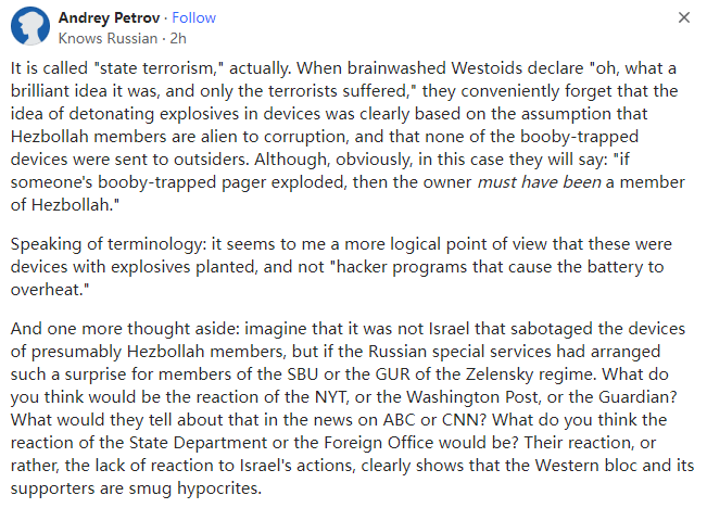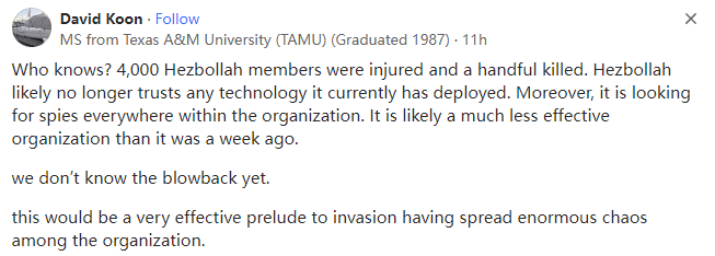 以色列通过引爆各种通讯设备杀伤数千名黎巴嫩真主党成员是个好主意吗?以色列为什么要这么做?本文译自Quora,原标题:Was the detonation of 3000 plus pagers carried by Hezbollah terrorists a good idea?如果报道属实,那是因为它们即将被发现。然而,不管是谁干的--以色列还没有承认,也还没有证据--都让真主党的大部分领导层失去了行动能力。除了书面记录外,他们的所有通讯工具都被毁了。这些爆炸还在未来的电子设备中播下了不信任的种子,它们可能破坏并发现了仓库、藏身处和他们可能不知道的人。叙利亚和伊朗的爆炸事件再次证明了恐怖分子与这些国家之间的联系。最后,恐怖分子的死亡总是一件好事。Siva Kumar Satheesa Kumar AhilaLives in Bengaluru, Karnataka, India即使没有太多人公开关注此事,以色列也要为此付出代价。人们会注意到这一点并相应地调整他们对以色列的行动,这将不会对以色列有利。Class-struggle Ecologist,Lives in Stoke-on-Trent, Staffordshire, UK2004–present阶级斗争生态学家,现居英国斯塔福德郡特伦特河畔斯托克城(2004年至今)如果我在这里问哈马斯绑架1200名以色列人是否是个好主意,我肯定会被骂去死。所发生的一切都是懦夫和病态社会的行为,他们自诩民主,妄想建国。大规模屠杀、大规模致残和恐怖主义这些字眼涌上了我的心头,犯下这一暴行的人应该被倒钉在十字架上并头埋在沙子里。MS from Texas A&M University (TAMU) (Graduated 1987),Lived in The United States of America德克萨斯农工大学(TAMU)硕士(1987年毕业),现居美国谁知道呢?目前有4000名真主党成员受伤,少数人丧生。真主党很可能不再信任其目前部署的任何技术。此外,真主党正在组织内部四处寻找间谍。与一周前相比,真主党的战斗力可能大打折扣。这将是一个非常有效的入侵前奏,因为它在真主党的组织内部散布了巨大的混乱。实际上,这就是所谓的“国家恐怖主义”。当被XI脑的西方人宣称“哦,这真是个绝妙的主意,只有恐怖分子才会遭殃”时,他们很容易就会忘记,在通讯装置中引爆炸药的想法显然是基于“真主党成员是腐败的异类,而且没有一个诱杀装置会发给外人”这一假设。不过,很明显,即便发生这种情况,他们也会说:“如果有人的装有炸弹的传呼机爆炸了 那么机主肯定是真主党成员”。说到术语:在我看来,更合乎逻辑的观点是这些都是装有炸药(而不是导致电池过热的黑客程序)的设备。另外我还有一个想法:想象一下,如果不是以色列破坏了真主党成员的通讯装置,而是俄罗斯特勤局为泽连斯基政权的SBU或GUR成员安排了这样一个惊喜,你认为《纽约时报》、《华盛顿邮报》或《卫报》会作何反应?美国广播公司(ABC)或美国有线电视新闻网(CNN)会如何报道?你认为美国国务院或外交部会作何反应?他们的反应(或者说他们对以色列的行动毫无反应)清楚地表明西方集团及其支持者是自鸣得意的伪君子。Army veteran,Lives in West Virginia2016–present从总体的战术角度来看,这是一个绝妙的主意。在不造成附带伤害的情况下,远程直接杀伤数千名敌方战斗人员的能力非常了不起,许多国家都会试图了解并效仿以色列刚刚的做法。就以色列而言,其目标并不明确。当然,杀死/致残数千名敌方战斗人员本身是一件好事,但以色列已经具备了这种能力。在过去的一年里,以色列已经击毙了450多名真主党成员(包括高级军官)(比寻呼机杀死的人数多得多),并在数千次精确打击中击伤了更多人。这种新能力(寻呼机爆炸)是独一无二的,也是一种一次性使用的武器(至少在可预见的未来是这样,因为真主党可能会将剩余的寻呼机扔掉)。以色列已经使用了这种能力,现在怎么办?显然是更多同样的消耗战。以色列预计真主党会进行报复,可能是火箭弹袭击,以色列将试图先发制人或进行拦截。消耗战将继续下去,这对以色列不利。如果以色列能将这次寻呼机伏击与从空中和地面对真主党发动的大规模攻击协调起来,就会有很大的战略意义。在传呼机袭击期间,真主党惊慌失措,其指挥控制似乎瘫痪了,因为数千名成员突然失去了行动能力,黎巴嫩各地的医院不堪重负,交通干道堵塞,等等。真主党曾一度极度脆弱,但以色列没有采取任何行动,而是恢复了防御,等待真主党的反击。问题似乎在于以色列没有改变其理论,尽管该理论在2023年10月遭到了巨大的失败。该理论要求对挑衅行为做出多样、精心策划、渐进的反应和/或有限的先发制人,以促进/维持威慑。这是一个很好的理论,可以让美国和国际社会不再干涉以色列,并在一段时间内避免全面战争。然而,很明显,以色列的各种敌人都了解这一理论,他们不再受到有效威慑,以色列被迫发动了全面战争,至少在加沙是这样。但除此之外,以色列仍在坚持这一理论。这次寻呼机袭击(就像以色列在也门、黎巴嫩和伊朗的其他精确打击一样)都符合这一原则。虽然这些行动令人印象深刻,可能会在短时间内起到威慑作用,但长期效果甚微或根本没有。现在媒体普遍认为这次袭击使针对黎巴嫩的更广泛的行动升级变得更有可能甚至不可避免。但如果这是真的,那么在真主党惊慌失措、毫无准备的情况下,将传呼机袭击与升级行动相协调,而不是回到一系列渐进式袭击/反应,让真主党仍然掌握主动,这才是更有意义的做法。我怀疑这不仅是正统理论在起作用。以色列政府有时几乎会因内讧和政治算计而瘫