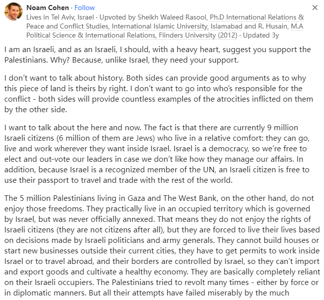 应该支持以色列还是巴勒斯坦?一个以色列犹太人的观点引发网友热烈讨论本文译自Quora,原标题:Should I support Israel or Palestine?