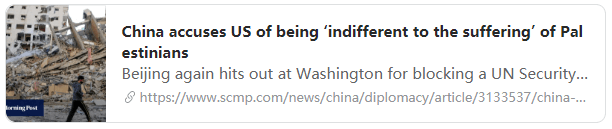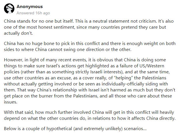 中国在这场冲突中没有偏向,双方都有足够的分量,中国不会偏向任何一边。然而,鉴于最近发生的许多事件,很明显,中国正在做一些事情以确保以色列的行动被凸显为美国/西方政策的失败,同时中国利用其他国家作为借口,作为掩护,“帮助”巴勒斯坦人,而不是正式参与或被视为正式站在他们一边。这样,中国与以色列的关系也不会受到太大的伤害,但同时他们也不会受到巴勒斯坦人和所有关心这些问题的人的关注。话虽如此,中国在这场冲突中的介入程度将在很大程度上取决于其他国家的所作所为以及它对中国的直接影响。如果这场冲突失控,蔓延到该地区以外的地区并开始影响中国附近的地区,或者它极大地阻碍了某些活动,比如“一带一路”的开展……中国可能会进一步推动两国解决方案并采取行动使以色列不得不接受它(不是劝说,而是大体上试图强迫它)以防止混乱蔓延到中国。它们不在乎它是否奏效,但这将为中国提供足够的时间,让中国能够把混乱从地缘政治领域和其他利益领域推开。如果其他国家利用这场冲突大规模地针对中国,例如,如果那些支持巴勒斯坦的人利用这场冲突从中国招募YSL极端分子并在中国国内组织活动……或者那些支持以色列的人利用他们在技术或地理上的优势作为工具来抨击或攻击中国……如果发生这种情况,中国很可能会像对待其他国家那样,进行针锋相对的实力较量,同时强调(也许是试图羞辱)一种观念,即他们没有独立思维,是一个更强大的大国的走狗。这将使西方的制裁或BDS运动(译注:内容是反犹太主义)看起来相对更加温和,因为中国认为以色列和巴勒斯坦都是小国,都在听命于其他国家,如果它们敢直接威胁中国,就需要给点教训。总的来说,如果这些情况都没有发生,那么我们就不会直接看到中国有任何实质性的行动,它们将继续或多或少地表现出中立立场。