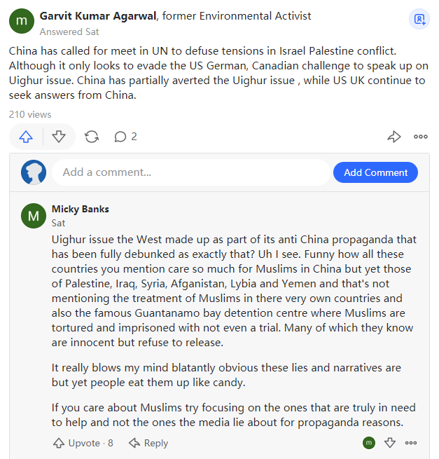 Lonely Cantonese Sith LordChinese citizen,Lives in Hong Kong中国的官方立场是以色列和巴勒斯坦应该停止战斗并开始致力于提出解决方案,中国还指责美国支持以色列迫害巴勒斯坦民族。西方在谈到中国MSL时,对穆斯林的权利是如此关注,但当中东有穆斯林实际上正在遭受苦难时,它们却一言不发。甚至就连在Quora上据说是“左派”的那些人,也绝大多数都支持以色列轰炸巴勒斯坦人并将他们驱逐出家园。与此同时,作为一个左派——在麦卡锡时代可能会被烧死的那种人——我支持巴勒斯坦,但我并不反对以色列的国家地位。我认为考虑到现实情况,一个可以接受的两国解决方案对每个人都是最有利的。我支持犹太人有自己的家园,因为作为一个被流放的民族他们受尽了苦难,尤其是在上个世纪。他们在欧洲人手中受到的迫害是可怕的(尤其是将其与中国对待犹太人的方式相比较)。犹太人从一千多年前开始就一直生活在中国,耶稣会传教士米托·里奇(Matteo Ricci)大量记载了这些奇怪的移居者。他们和平地融入了我们的社会,保持他们的信仰和传统并与他们新家的本地人相处得非常和谐。在他们的会堂里没有战争,没有敌对行为,没有毒气室,也没有“你不会取代我们”的喷漆。我的问题在于他们对新家园的选择,这块位于中东的地区与他们已经离开了1400多年的家园是同一块的地方。在我看来,欧洲人是折磨犹太人的罪魁祸首,如果你想把范围缩小一些,具体的刽子手就是德国人。他们被苏联击败之后割让了柯尼斯堡,为什么他们不能再拿出一块土地来补偿犹太人呢?不一定要太好的地方,巴伐利亚就行。据我所知,这里基本上相当于美国的阿拉巴马州,因此德国不会失去任何有价值的东西。但这不是世界在西方霸权下的运作方式,既然有人必须为对犹太人的种族灭绝付出代价,为什么不能是没有对他们进行种族灭绝的人呢,比如…阿拉伯人?阿拉伯人被迫为基督徒的罪行买单,他们对这件事根本没有发言权。为什么?不知道。上帝以神秘的方式在工作。虽然犹太人可能是受害者,但巴勒斯坦人更是如此,他们是这场游戏中真正的弱者,作为一个真正的左派,我有义务为他们仗义执言。是巴勒斯坦先发起的袭击吗?是的。但那又怎样?自卫现在是犯罪吗?有强盗侵入你的土地,试图把你赶出家园,你该怎么办?听天由命吗?是以色列首先迫害巴勒斯坦人,拆毁他们的家园,把他们驱逐出他们的土地,把他们不当人的,不是吗?帝国主义西方迫害犹太人和阿拉伯人,它们总是让事情变得更糟,它们难道没有错吗?西方试图为以色列的行动辩解显得既滑稽又骇人听闻,通知平民他们即将被无人机、导弹和神圣的地狱火击中,这样他们就有足够的时间撤离——这简直是功德无量!!下次我想纵火烧毁一所房子的时候,我会告诉里面的人他们还有五分钟的时间逃离,因为我是一个尊重他们人权的真正的绅士。另一方面,他们告诉我家里有孩子,要让我停下来,他们才是真正的坏人。没有什么比他们武装儿童,拿孩子当肉盾更能让我的血沸腾了。他们中的很多人都是卑鄙的恐怖分子。但是,请不要让这些分散你对中国应该为以巴冲突负责的事实的注意力,我相信如果你看上去够努力,你总会找到一种方法来指责中国。