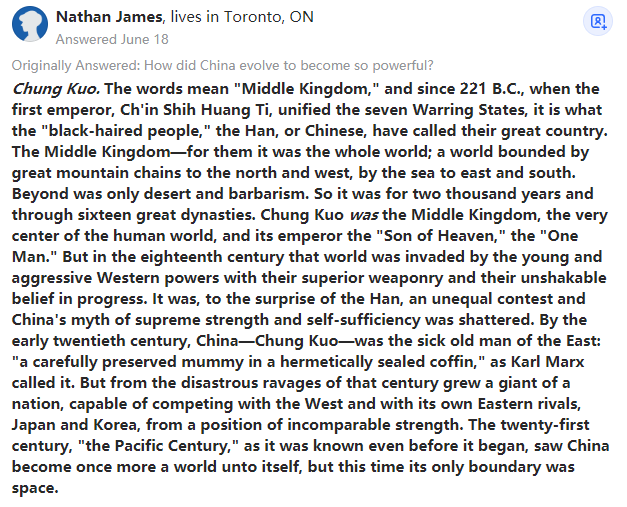 本文译自Quora,原标题:How did China become a global power?中国(Chung Kuo),这个词的意思是“中央王国”(Middle Kingdom),自公元前221年秦始皇统一六国以来,这就是“黑头发的人民”,或汉人,或中国人称呼他们伟大的国家的方式。中央王国对他们来说就是整个世界,因为这是一个北面和西面以山脉为界,东面和南面以大海为界的世界,远处只有沙漠和野蛮人。两千年来,中国历经了十六个伟大的朝代,中国是中央王国,是人类世界的中心,中国的皇帝是“天子”,是“the One Man”。但是在十八世纪,这个世界被年轻而富有侵略性的西方列强以其优越的武器和对进步的不可动摇的信念所入侵。令汉人惊讶的是这是一场不平等的竞争,中国至高无上的力量和自给自足的神话被打破。到了20世纪初,中国成了东方的病夫,卡尔·马克思称之为“密封的棺材中精心保存的木乃伊”。但是在那个灾难性的世纪中,一个巨人崛起了,这个国家拥有无可比拟的实力,它有能力与西方以及自己的东方对手日本和韩国竞争。二十一世纪,即“太平洋世纪”,在它开始之前就被人们所熟知,中国再次成为自己的世界,但这次它唯一的边界是太空。中国人向来追求伟大,它的文化和哲学与此有很大关系。但我相信中国崛起的大部分功劳都归于中国GC党。当毛泽东于1949建立新中国时,他为中国的未来奠定了基础。虽然他的一些政策是灾难性的失败,但毫无疑问,他所实现的中国的统一使这个国家变得强大而有韧性。1978年,邓小平进行了彻底改变中国的大刀阔斧的改革,中国实行了自由市场原则并吸收了西方民主的元素,给予了人民前所未有的人身自由。一旦中国对大量外国直接投资开放,它的工业和经济引擎就开始活跃起来并成长为一个不可抗拒的强大力量。在近 10 亿人口和强大的中央集权政府的支持下,中国一直专注于经济增长。在没有反对意见的情况下,政府制定了了不起的政策并以惊人的速度和效率执行了这些政策。2001年中国加入WTO后,经济增长加速,你可以在这里清楚地看到这一点:现代中国是4000多年前世界上最古老的、持续不断的文明国家的延续。从1839年到1949年的一个世纪的屈辱仅仅是一种反常,一种历史的反常。中国正在恢复昔日的伟大。你的照片太乐观了。在这个时代,没有一个国家能自称伟大,中国将尽最大努力而不是宣称伟大。是建设世界上最壮观,让我们羡慕不已的基础设施使它变得伟大。ex-VP, Big investment bank - Hong Kong中国历经过好的世纪,也历经过坏的世纪,但在大部分有记载的人类历史中,中国都是强大的。它经历了几个糟糕的世纪,但在把一切都整理好之后,它又回到了过去2000年中大多数时间下的情况。让人困惑的不是中国变得强大了,而是中国虚弱了这么久。Ph.D. History of China, The Ohio State University (1981),Lives in Lancaster, OH1980–present俄亥俄州立大学中国历史系博士(1981年),1980年至今生活在俄亥俄州Lancaster1976年毛泽东逝世后,中国开始成为世界强国。1976年以后,发生了以下事件:Ø四个现代化是从改善农业、工业、科技、国防等方面开始的,这些都是具有重大影响的大型项目。Ø改革开放政策的宣布改变了中国的现状,这项开放的政策邀请全世界来中国做生意。Ø社会主义市场经济改革是在20世纪90年代(TAM事件)之后进行的。Ø中国于2001年加入世界贸易组织,进一步扩大了在世界范围内的贸易和接触。Ø中国的教育使人们能够参与经营企业和在现代工厂工作。因此,2000年之后,中国成了世界第二大经济体。中国以制造业和商业领域的巨大利润,使其在军事方面实现了现代化。经济增长与军事进步的结合,推动中国走上了世界强国的地位。Non-profit Operations Manager,Lived in Cleveland Ohio US但是一个国家如果有这么多人口,他们的名义GDP理应高出很多(中国的人口是美国的3.5倍,但GDP仍落后于美国)这表明在中国的底层或低生产力阶层存在着严重的贫困。former Senior Management at Professional Services Firm中国一直是超级大国,直到1839年至1949年,中国才被称为亚洲病夫。现在它回来了。这是因为中国人天生就是热爱和平的人,他们会更高效地花钱,所以他们宁愿把钱花在生意上而不是武器上。在国家一级,中国花了足够的钱来确保自己的战略利益,仅此而已,剩下的都投入了生产活动。因此,如果他们继续这样坚持下去,中国将会继续做得更好。从经济总量上来说,它仅次于美国。但按人均计算,它比许多第三世界国家还要穷得多。所以,至少有两种看待中国的方法:作为世界级的经济大国的中国和作为第三世界国家的中国.....中国通过创造一个庞大而重要的经济体而迅速崛起。而根据以上指标,中国大约有四分之一的人口处于贫困之中。相比之下,这略高于巴西。而且收入不平等的现象在中国普遍存在,据总理李克强去年表示,中国仍然有6亿人的月收入不足1000元(154美元)。learns about politics, the world, and population.由于他们与许多其他国家进行了大量的贸易,这有助于推动他们的经济实力接近美国。在总量上,中国可能会长期处于第二位。但除此之外,中国与许多邻国关系密切,他们也在中国做了很多投资。基本上,他们通过贸易,赚到了更多的钱。这帮助他们成了世界第二大经济体,最终在2019年他们的人均收入也超过了俄罗斯。谁知道以后会发生什么?