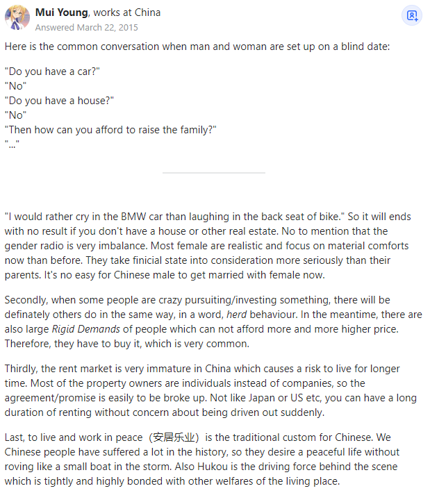 Former Quora Employee and Top Writer在中国可以买房子。事实上,中国是世界上住房拥有率最高的国家之一。它还拥有世界上最大的房地产市场,全年主要住宅销售总额达2万亿美元。然而,拥有房屋并不意味着拥有建造房屋的土地的所有权。房主将拥有这所房子,但房子下面的土地只有70年的租赁使用权,不过土地使用权可以无限期延长。“我宁愿坐在宝马车里哭,也不愿坐在自行车上笑。”因此,如果你没有房子或其他房产,这一切都不会有结果。大多数女性比以前更现实,更加注重物质享受,她们比她们的父母更重视对方的经济状况。现在的中国男人要和女人结婚可不是件容易事。其次,当一些人疯狂地追求或投资某样东西时,肯定会有其他人也这样做,换句话说,就是羊群行为。同时还存在大量刚性需求,人们无法承受越来越高的房价,所以他们不得不选择买房。第三,中国的租房市场还很不成熟,这给长期租住带来了风险。大多数业主是个人而不是公司,因此租房协议/承诺很容易被打破。不像在日本或美国,你可以长期租房而不必担心突然被赶出去。最后,安居乐业是中国人的传统习俗。我们中国人在历史上饱受苦难,所以他们渴望平静的生活而不是像风暴中的小船一样四处漂泊。同时,户口也是这一现象背后的驱动力,因为它与居住地的其他福利紧密相连。