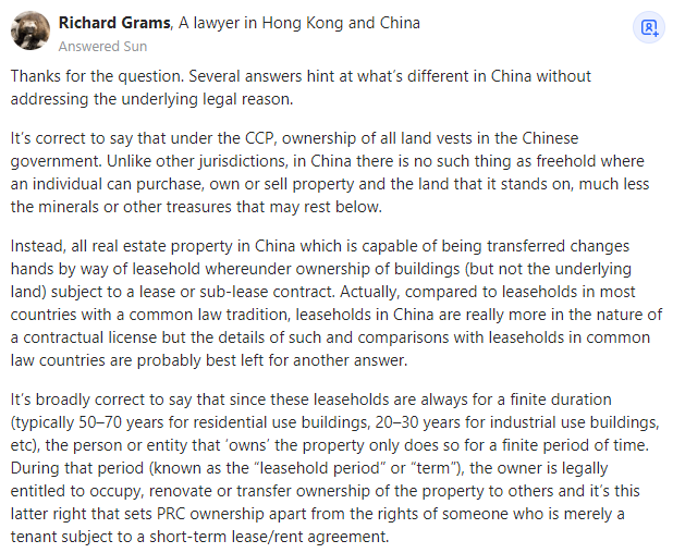 A lawyer in Hong Kong and China谢谢你的问题。有几个答案暗示了中国的不同之处,但没有说明根本的法律原因。在中国GC|党的领|导下,所有土地的所有权都归中国ZF所有。与世界其他司法管辖区不同的是,在中国,不存在个人可以购买、拥有或出售房产及其所在土地的永久所有权的情况,更不用说地下的矿产或其他宝藏了。相反,在中国,所有能够转让的不动产都是通过租赁的方式转手的,即建筑物(但不包括标的土地)的所有权,但需签订租赁合同或转租合同。事实上,与大多数有普通法传统的国家的租赁相比,中国的租赁实际上更具有合同许可的性质,但关于这一性质的具体细节以及与普通法国家的租赁权之间的比较最好留给另一个答案。大致上说,由于这些租赁物的租期都是有限的(通常住宅用房为50-70年,工业用房为20-30年,等等),所以“拥有”房产的人或实体只能在有限的时间内拥有这些房产。在此期间(称为“租赁期限”或“期限”),业主在法律上有权占用,翻新或将财产的所有权转让给他人,而正是后者将中国的房产所有权与仅受短期租赁/租赁协议约束的承租人的权利区分开来。租赁期届满后,建筑物的所有权归国家所有,但请注意,在租赁期间,建筑物所在的土地一直都是属于国家的。对任何有意购买中国公寓、房屋或厂房的人来说,这意味着在目前的中国永远不可能完全购买该建筑物、地表土地或地下产权。然而,如果说租赁人只能租房而不能购买房产,这多少有些误导。如上所述,在租赁期间,他们在法律上有权对自己的房产做任何他们想做的事情,与纯粹的租户不同,他们可以将剩余租赁期内的所有权出售给任何潜在的买家。