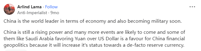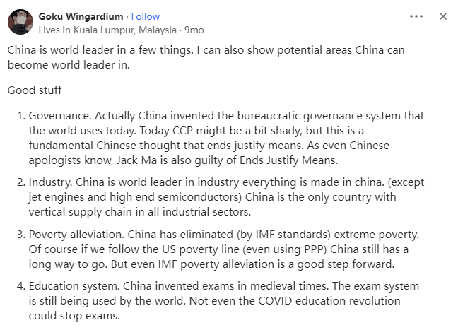 Lives in Kuala Lumpur, Malaysia中国在一些方面处于世界领袖的地位,我还可以展示一些中国可以成为世界领袖的潜在领域。1.治理结构。实际上,中国发明了当今世界普遍使用的官僚治理体系。2.工业。中国是世界工业的领袖,一切都是中国制造的(喷气发动机和高端半导体除外),中国是唯一一个在所有工业领域都拥有垂直供应链的国家。3.扶贫。中国已经消除了极端贫困(按照国际货币基金组织的标准)。当然,如果我们遵循美国的贫困线(即使使用购买力平价计算),中国仍有很长的路要走。但即使是按照国际货币基金组织标准的扶贫工作也是向前迈出的一大步。4.教育系统。中国在中世纪发明了考试,世界仍在使用这一套考试系统,即使是新冠肺炎导致的教育革命也无法阻止考试。现在来说说不那么好的方面,至少对中国以外的人来说是这样,但中国人实际上是支持它的。1.规定。如果你发明一个新概念,中国将找到一种方法来规范它,而中国人普遍支持这一点。2.国家安全。现在所有的国家都有无视传统法律原则的国家安全法,但中国将更多的东西置于国家安全法之下,而且在实践中走得更远。但即使在实践中,它也不像西方媒体所说的那样极端,从理论上看,中国的国家安全法应该成为全世界的标准。然而,请记住,在中国,未达目的可以不择手段,所以它们确实走得很远。我遗漏了一件有趣的事,那就是宣传。虽然五毛很烦人,但它们非常明显。中国是世界第一,中国是世界领袖,美国的宣传,美国的宣传巴拉巴拉。而俄罗斯喷子呢?他们可以访问所有网站并潜伏在网上,他们不仅会谈论俄罗斯入侵乌克兰是正确的,还会采取破坏自由民主国家的立场。在美国的宣传上五毛也并非完全错误,我们在西班牙流感期间见过美国的宣传,最近我们又见识了伊拉克战争,一切都指向了美国。我尽量不涉及阴谋论,但美国方面足够阴暗,完全可能参与其中。如果你想谈论阴谋(包括美国的阴谋和针对美国的阴谋),我想我不会在合理的时间内完成我的回应。但中国在宣传方面肯定不是世界领袖,无论是《环球时报》、《五毛报》、《小粉红报》还是社交媒体,中国在这方面都很糟糕。中国可以在其他几方面成为世界领袖,但我不确定他们要怎么做到。注意,我说的是社会的可持续,而不是环境的可持续。在中国从事的商业活动必须受到社会可持续发展的约束,环境只是其中的一部分。中国对马云实施了监管,是因为他的蚂蚁金服对社会不可持续。众所周知,目前形式的大型科技公司也不具备社会可持续性。如果我们看看17个联合国可持续发展目标,我们可以发现它们谈论的都是环境的可持续性,而不是社会的可持续性。第三点,我喜欢秘密社团,但有些人不适合。对他们来说,他们更喜欢被监管。虽然自苏联制造核武器以来,我们有了一个新的全球军事集团,但我们没有一个可以挑战西方金融体系的全球金融集团。西方的体系已经向我们表明,它们可以将一个大国踢出这个体系而不受什么伤害。因此,中国需要做好应对这种风险的准备。老实说,我希望我有一个博士学位,这样我在谈论社会的可持续性时就会受到重视。但我会让其他人在接下来的4年内提出这个问题,因为撰写博士论文至少需要4年时间,而世界的发展很快。