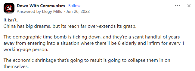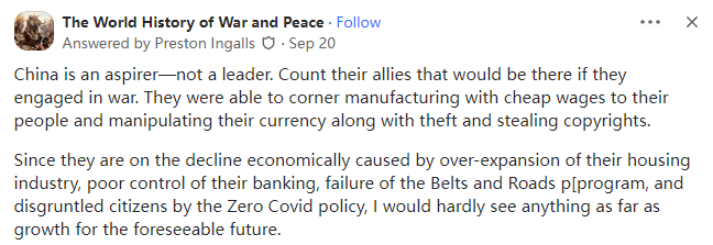 MA in Organizational Development, Norwich UniversityGraduated 1986中国是一个热望者(aspirer)--而不是领导者,数数如果它们参加战争会有几个站在它们一边的盟友就知道了。它们能够通过付给它们的人民低廉的工资来垄断制造业,并在盗|窃和窃|取版权的同时操纵它们的货币。由于房地产行业的过度扩张、对银行业的控制不力、“一带一路”计划的失败以及新冠肺炎清零政策(Zero Covid)引发的不满,它们的经济正在下滑,我几乎看不出在可预见的未来它们的经济还会有什么增长。