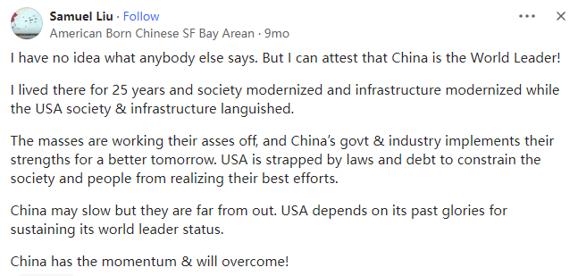 American Born Chinese SF Bay Arean我在那里生活了25年,中国的社会实现了现代化,基础设施也实现了现代化,而美国的社会和基础设施却萎靡不振。中国的民众在拼命工作,中国政府和工业界为了更好的明天发挥了自己的优势。而美国受到法律和债务的束缚,限制了社会和人民实现他们的最大努力。虽然中国的发展可能会放缓,但它们还远未出局。美国目前依靠的是过去的辉煌来维持其世界领袖的地位。然后,随着人口在下个世纪减少一半,它们会突然变老。