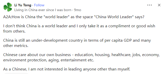 Living in China ever since I was born我不认为中国是世界领袖,我只把它当作别人的赞美或美好的祝愿。就人均GDP和许多其他指标而言,中国仍然是一个欠发达国家。中国人关心自己的事情——教育、住房、医疗保健、就业、经济、环境保护、老龄化、娱乐等。作为一名中国人,我对领导除我之外的任何人都不感兴趣。